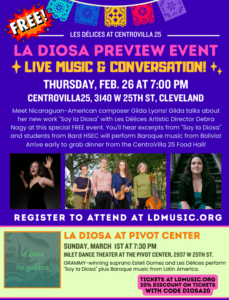Join us for an intimate evening with Nicaraguan-American composer Gilda Lyons as she discusses her new work “Soy la Diosa” with Les Délices Artistic Director Debra Nagy!